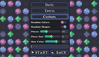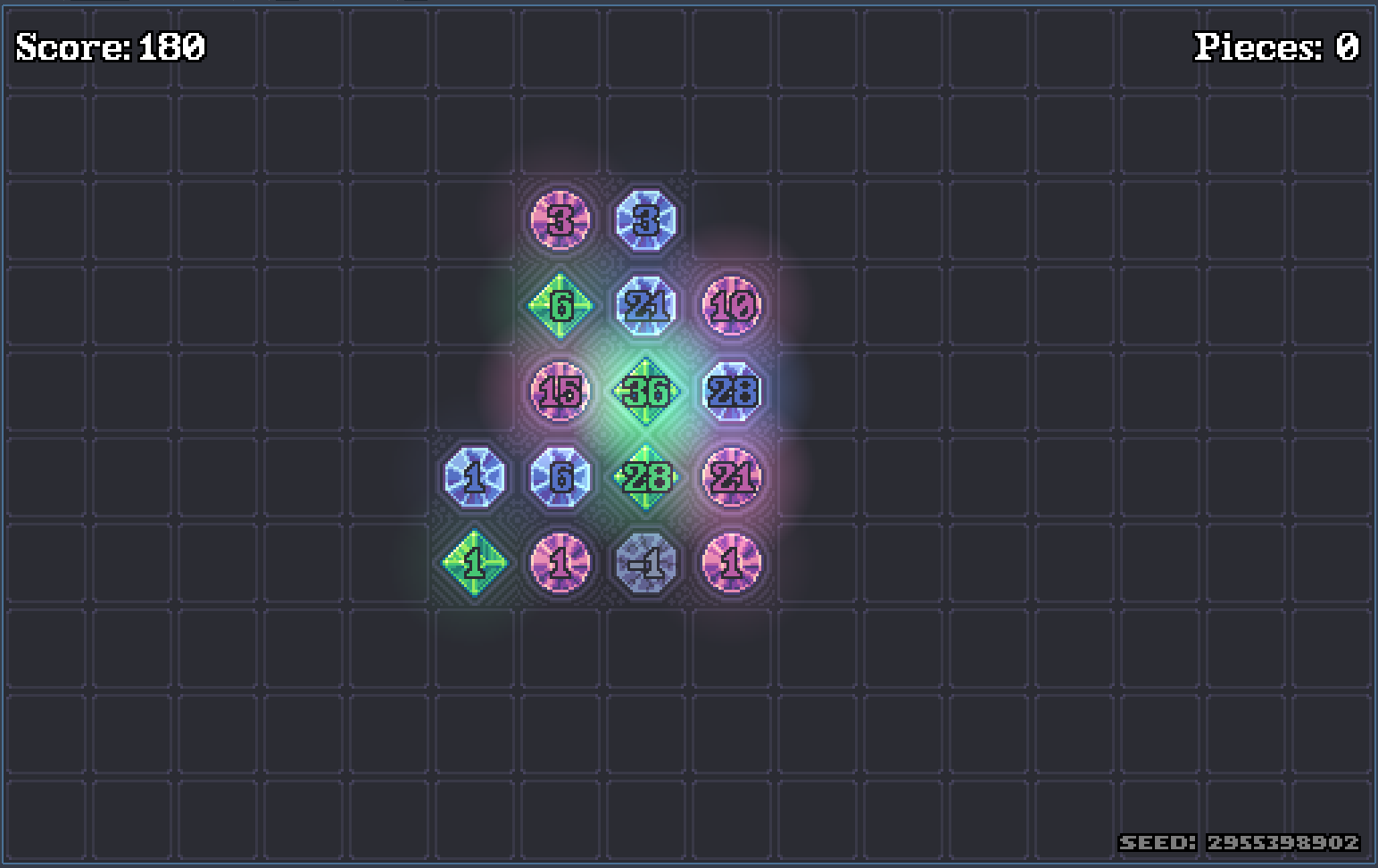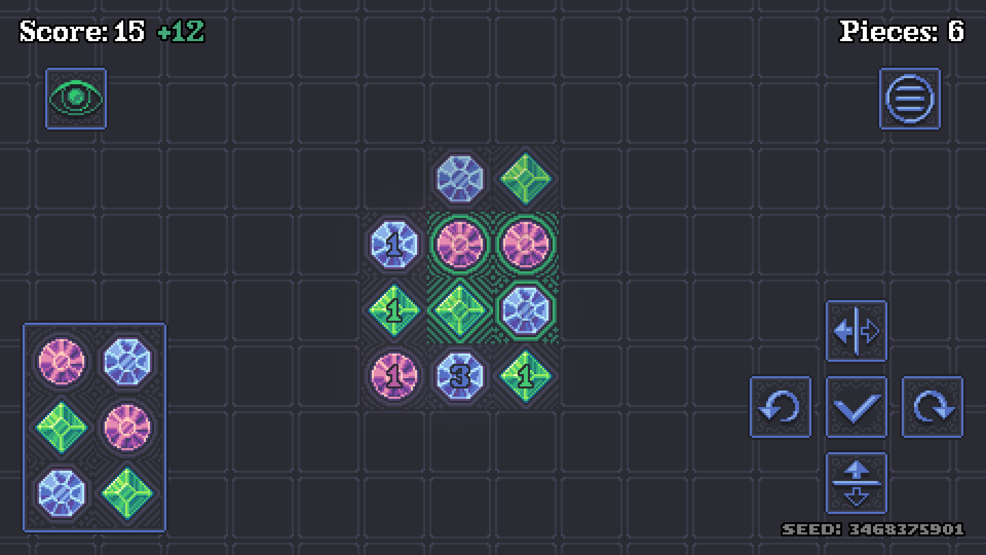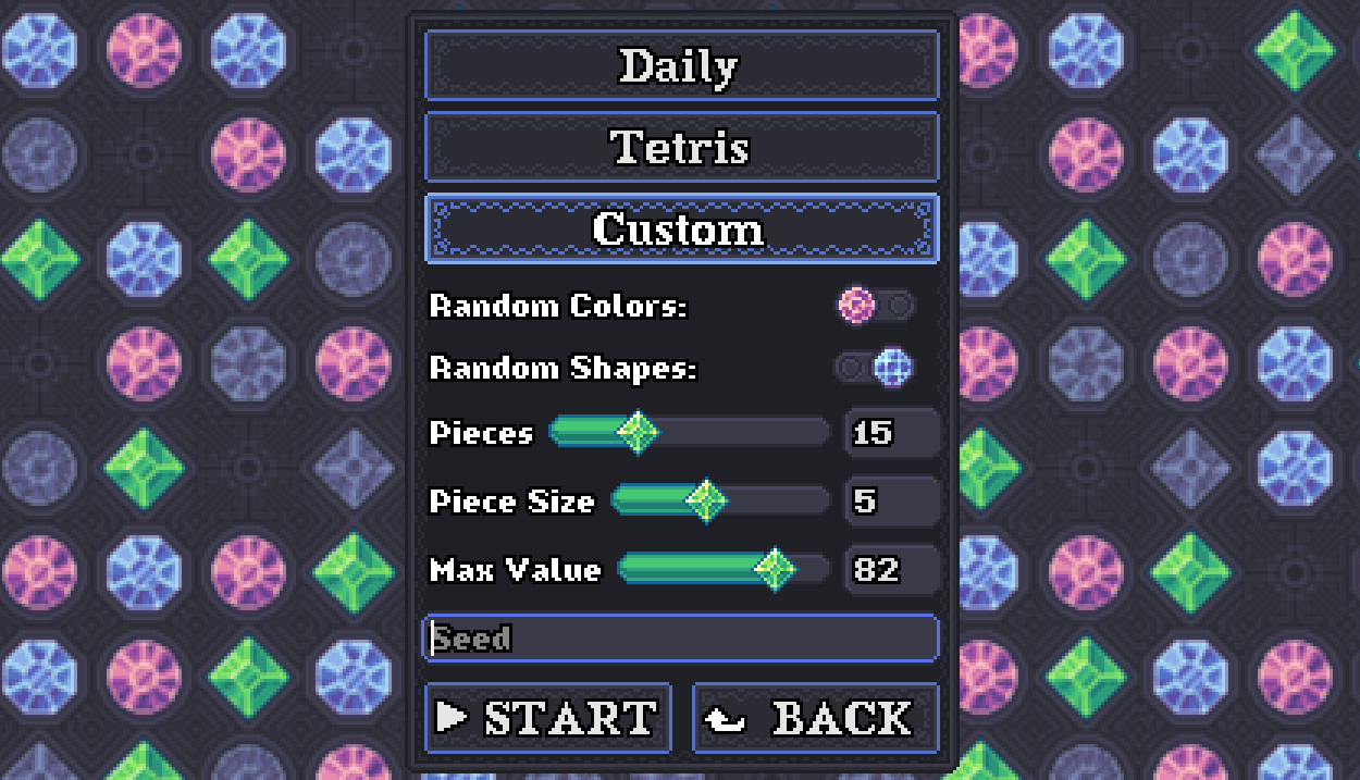 Stack gems of the same color to increase their value exponentially with each stack. Be careful not to place a mismatching colored gem, because it will break and give you negative points! You can freely rotate and mirror the pieces before placing.